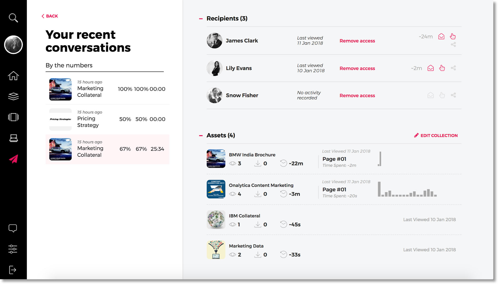 Instead of bulky repositories or cluttered email attachments, Paperflite gives sellers a personalized content library, the ability to create personalized content hubs for clients (called microsites), and real-time engagement analytics.