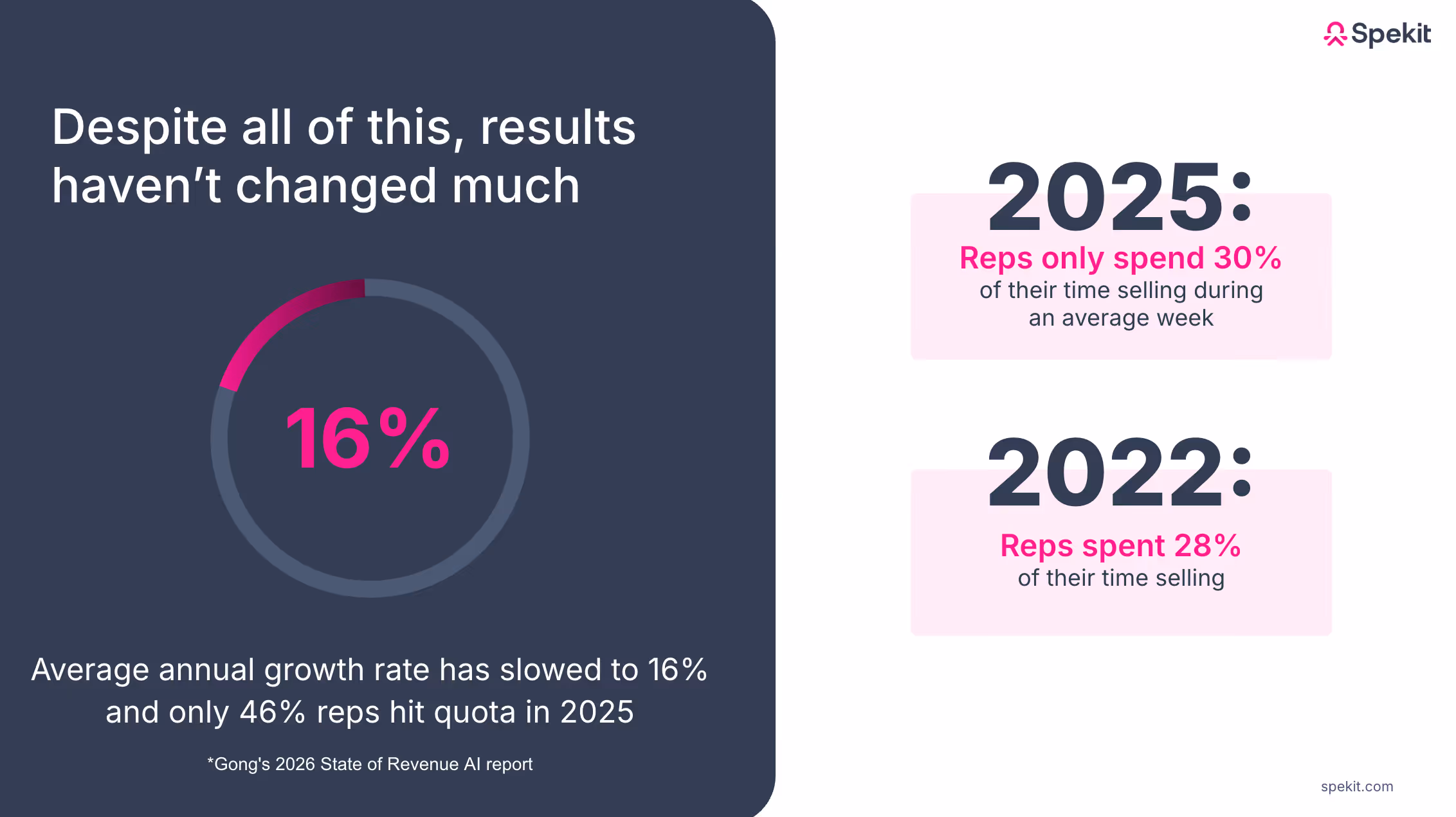 Gong’s 2026 State of Revenue AI report, based on 3,900 companies, showed average annual growth slowing to 16%, with 46% of reps hitting quota in 2025. Salesforce’s research showed reps spent 28% of their week selling in 2022, and 30% in 2025.