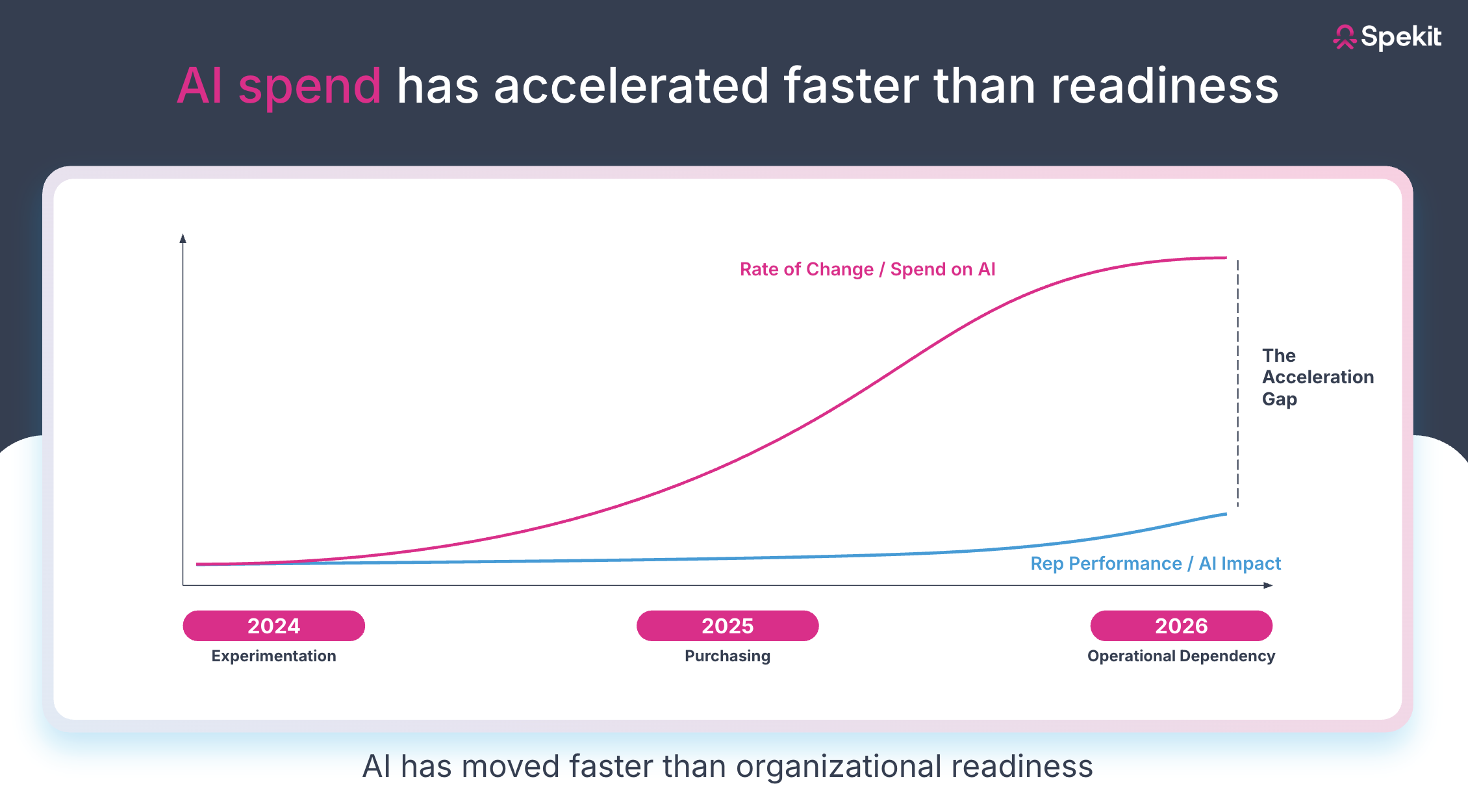 AI has become a board-level priority. Teams have experimented. Teams have purchased. Now AI is entering day-to-day operations. The investment curve has moved fast but the rep outcomes have moved slowly.