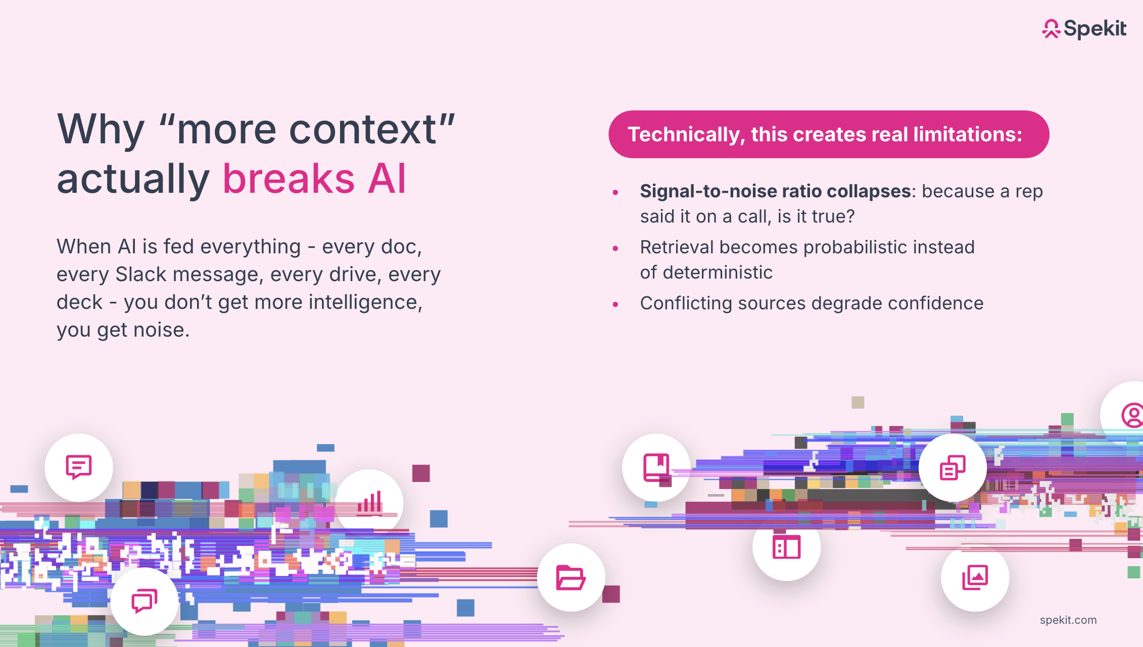 She then explained why. A sentence can exist in a doc, a call, or a Slack message. Existence does not equal truth. AI systems often return what seems most likely from the available sources.
