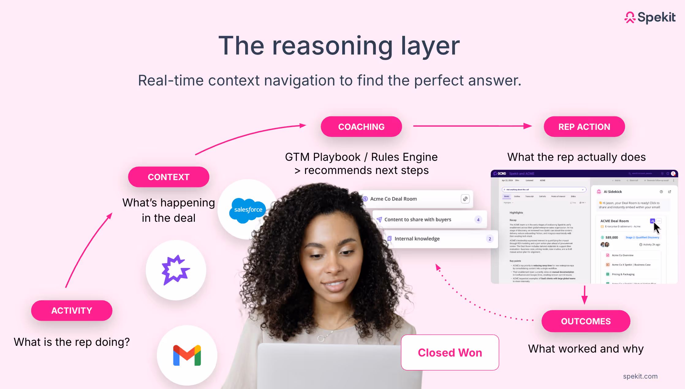 Spekit AI Sidekick surfaces the deal room, the latest call context, next steps, and a short list of relevant assets directly where the rep is already working.