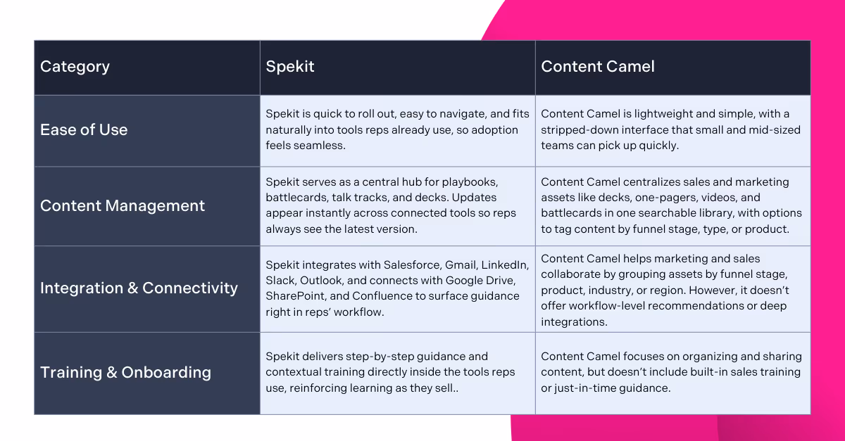 Unlike Content Camel, Spekit is designed around how sales teams work today, seamlessly connecting into their daily workflows to deliver the right playbooks, case studies, process guidance, coaching, and more without taking them away from wherever they’re selling.