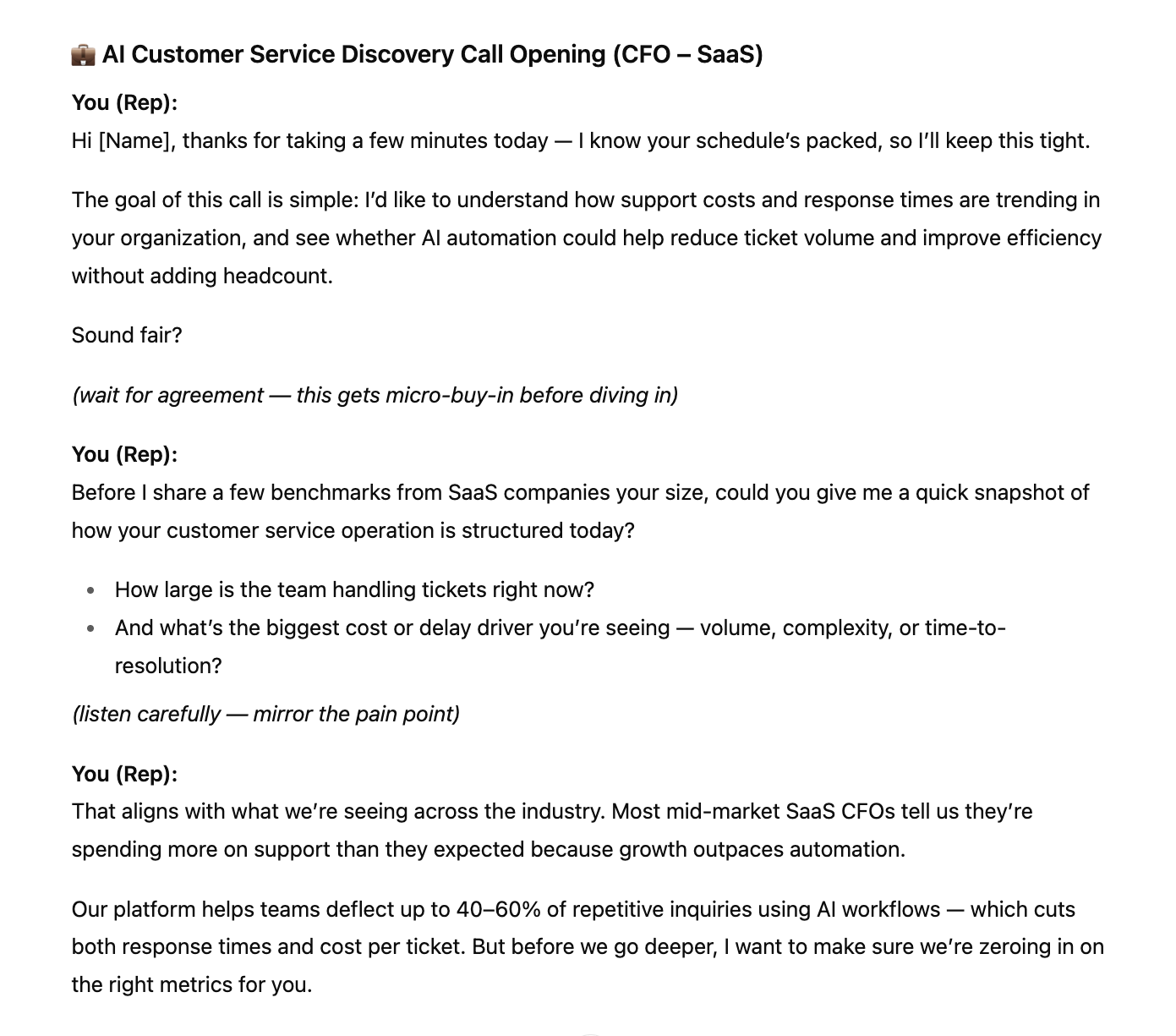 Here’s what the previous sales script looks like when tailored to a CFO at a 300-employee SaaS company: