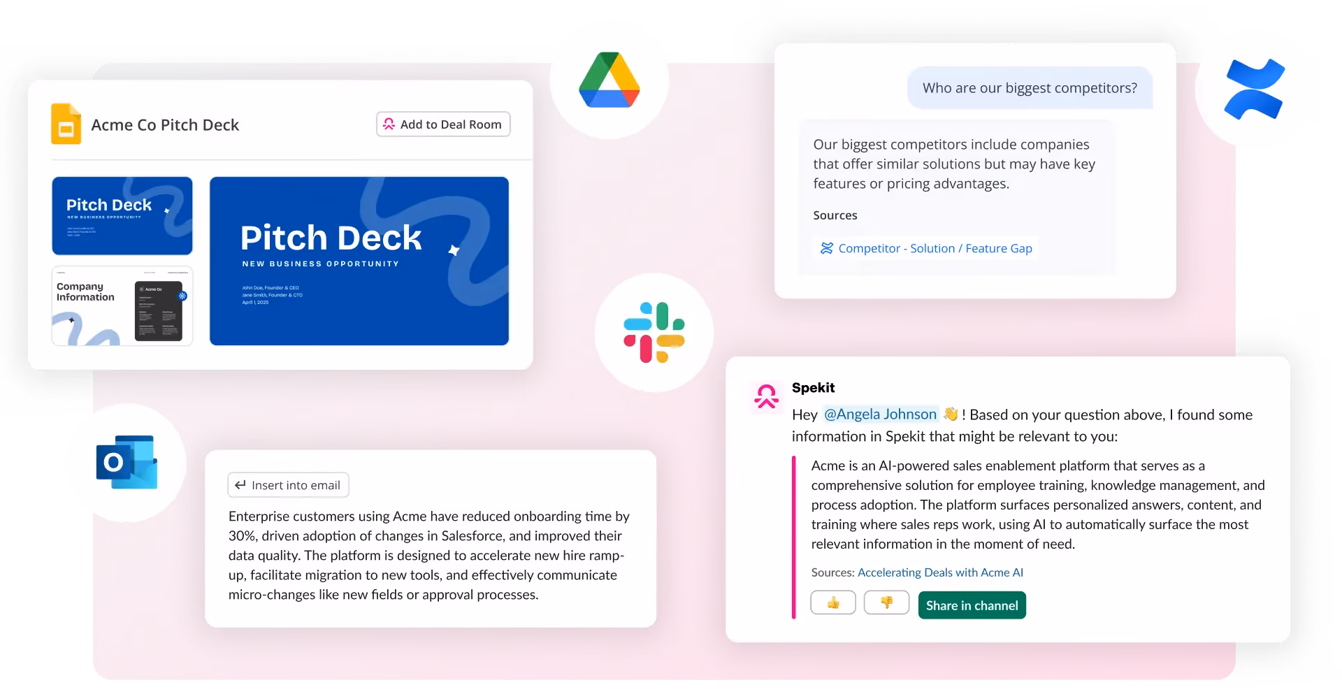 - AI Sidekick: AI-powered just-in-time enablement assistant™ that leverages signals from CRM, call intelligence, and communication tools to deliver personalized guidance, content, and recommendations directly to reps. Sidekick agents automate content curation and creation with Spekit Deal Rooms, support change management, and orchestrate task completion with embedded tooltips.