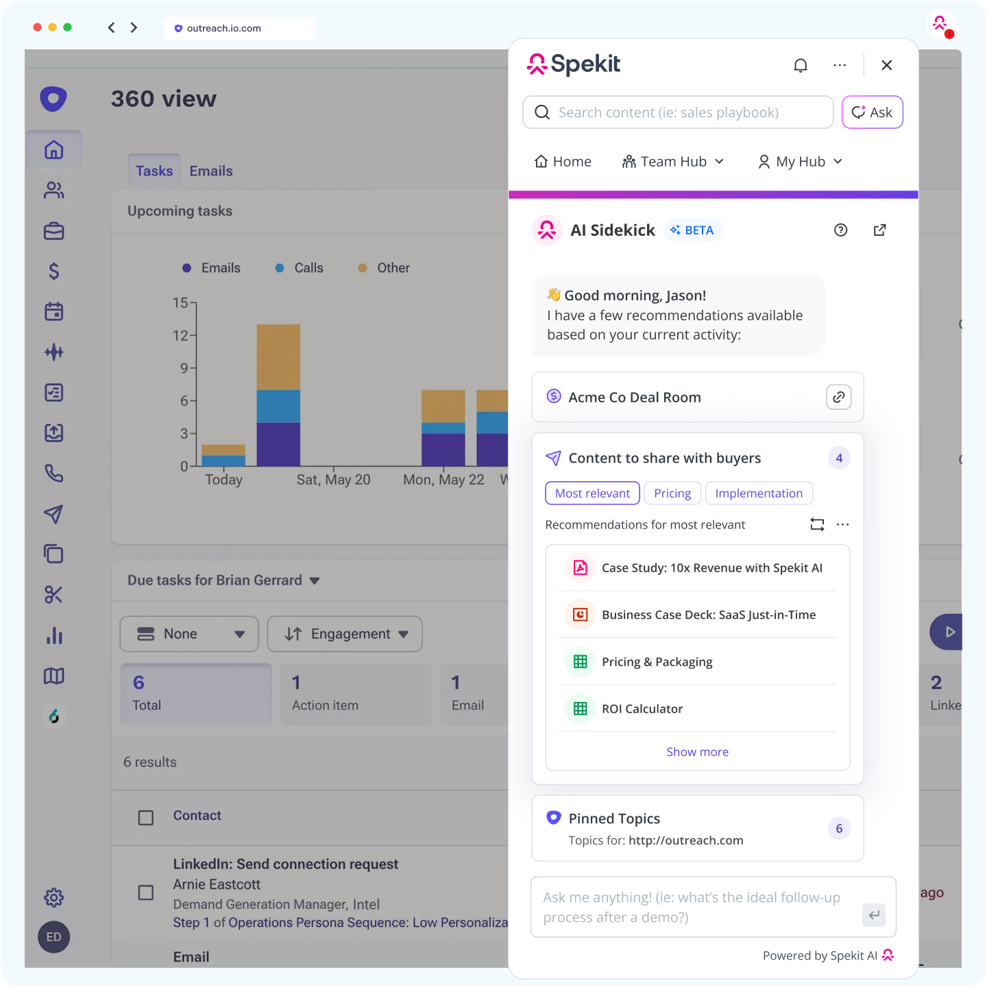 Spekit's AI Sidekick automatically reviews recent call notes, opportunity details, and CRM data to recommend the most relevant content or play for each prospect, directly in the flow of work. Instead of wasting time searching through folders or messaging marketing for help, reps get personalized, AI-driven suggestions—like which case study, one-pager, or follow-up email to send—right inside Salesforce, Gmail, or Slack. This ensures faster, more personalized outreach that keeps deals moving down the pipeline.
