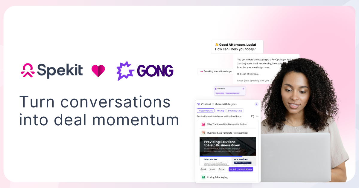 Together with Gong’s Revenue AI OS, Spekit equips every seller with the clarity, context, and next steps they need to execute at market speed. Read the full press release here and see how you can get started today.