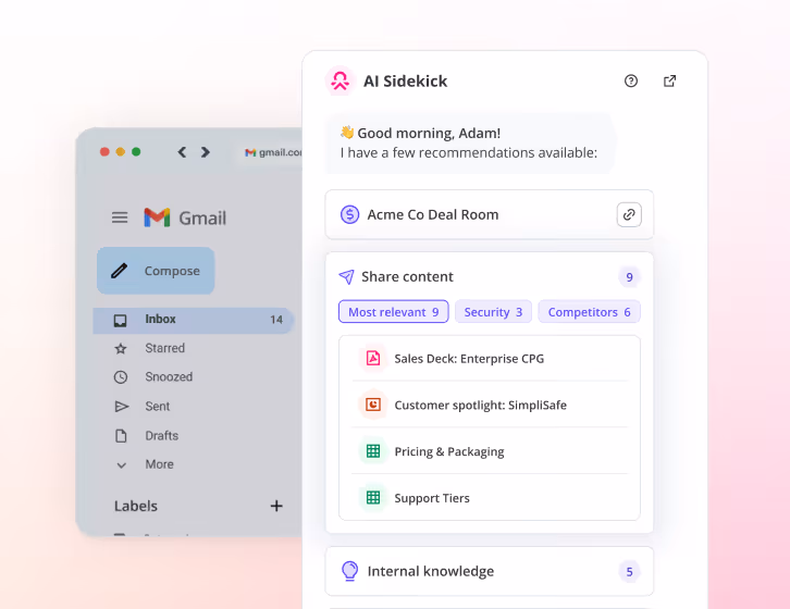 Sidekick lives inside Gmail, Gong, Salesforce, Slack, and more so the right guidance shows up without distracting from selling.