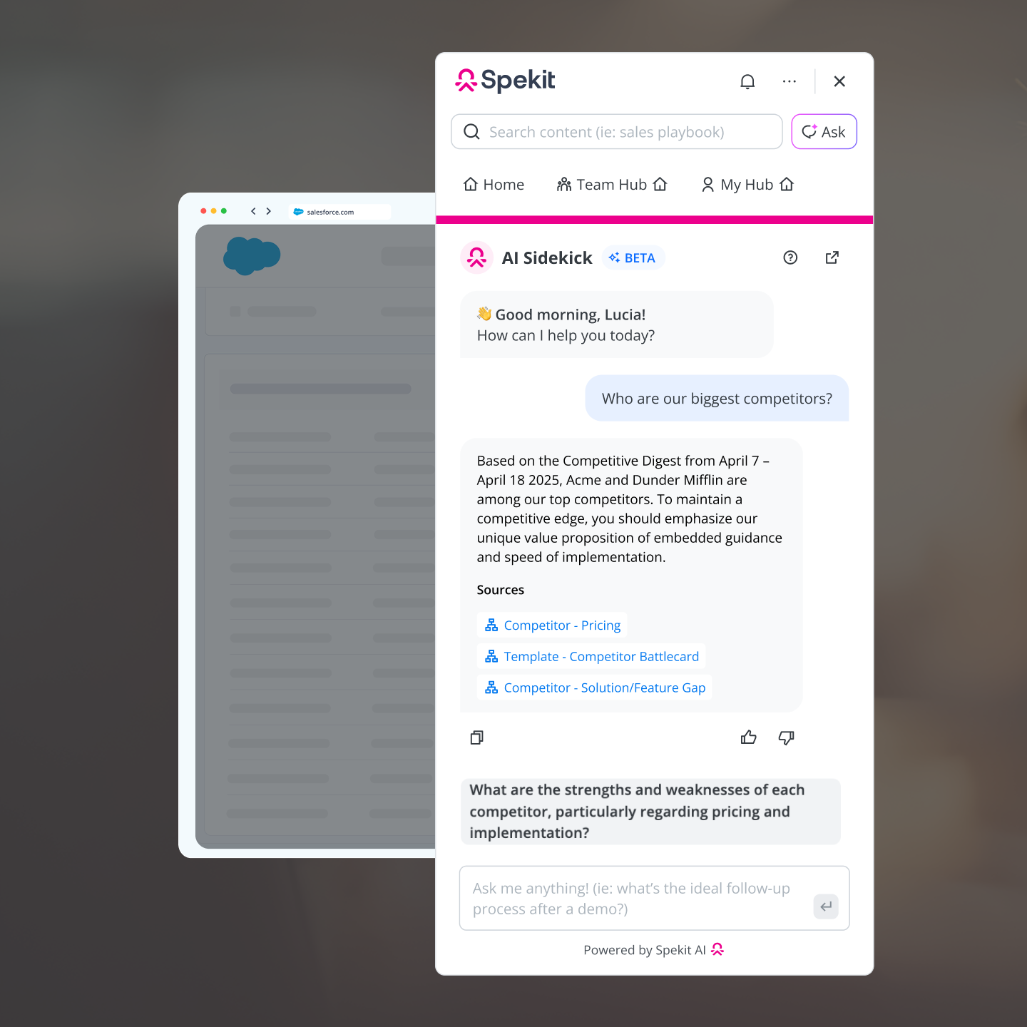 Spekit is built for execution: AI-powered, grounded in governed GTM knowledge, and delivered everywhere your reps work.