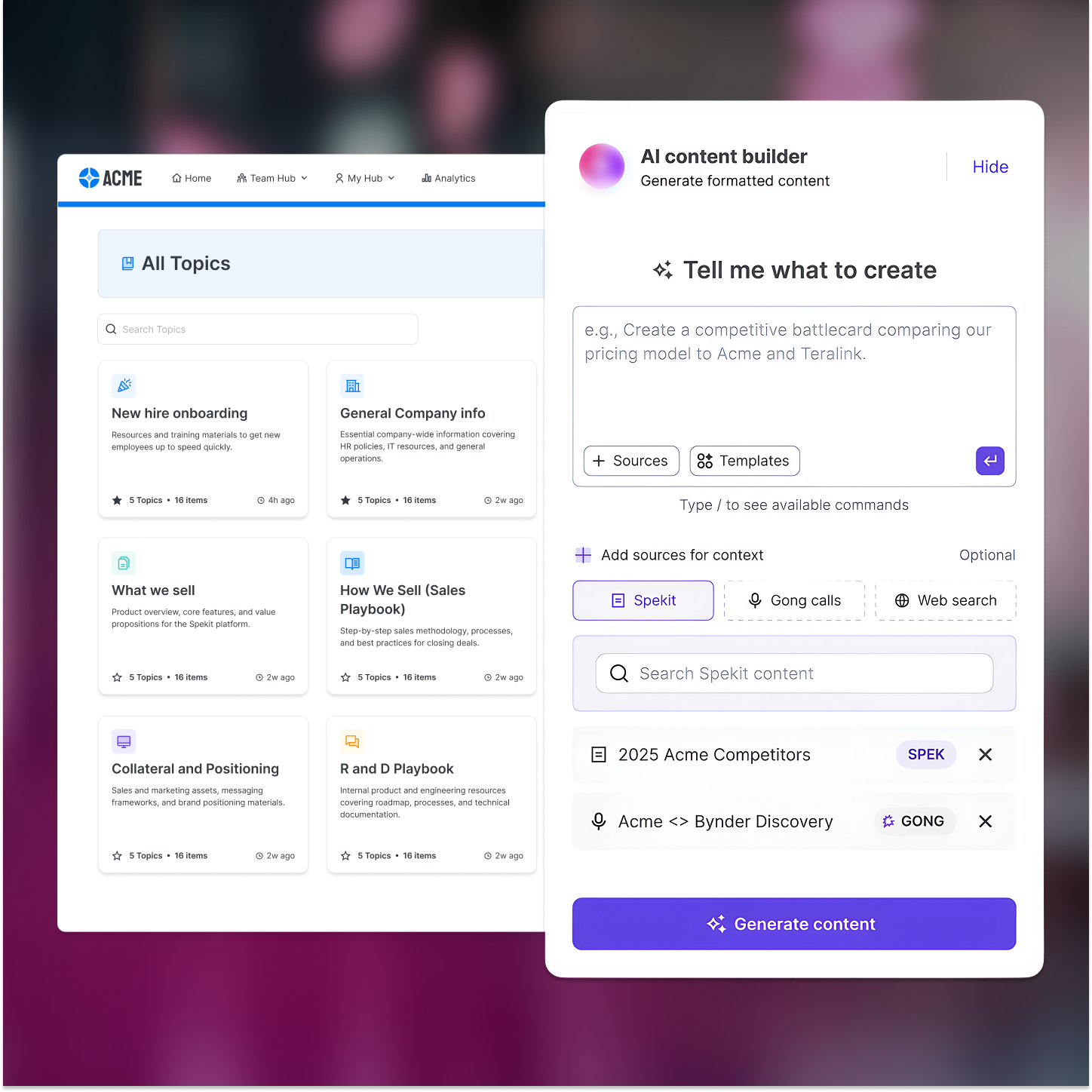 Spekit was built with AI as the orchestration layer from day one. Coaching, content creation, and deal context run through a unified agentic system rather than AI features layered onto a legacy content library.