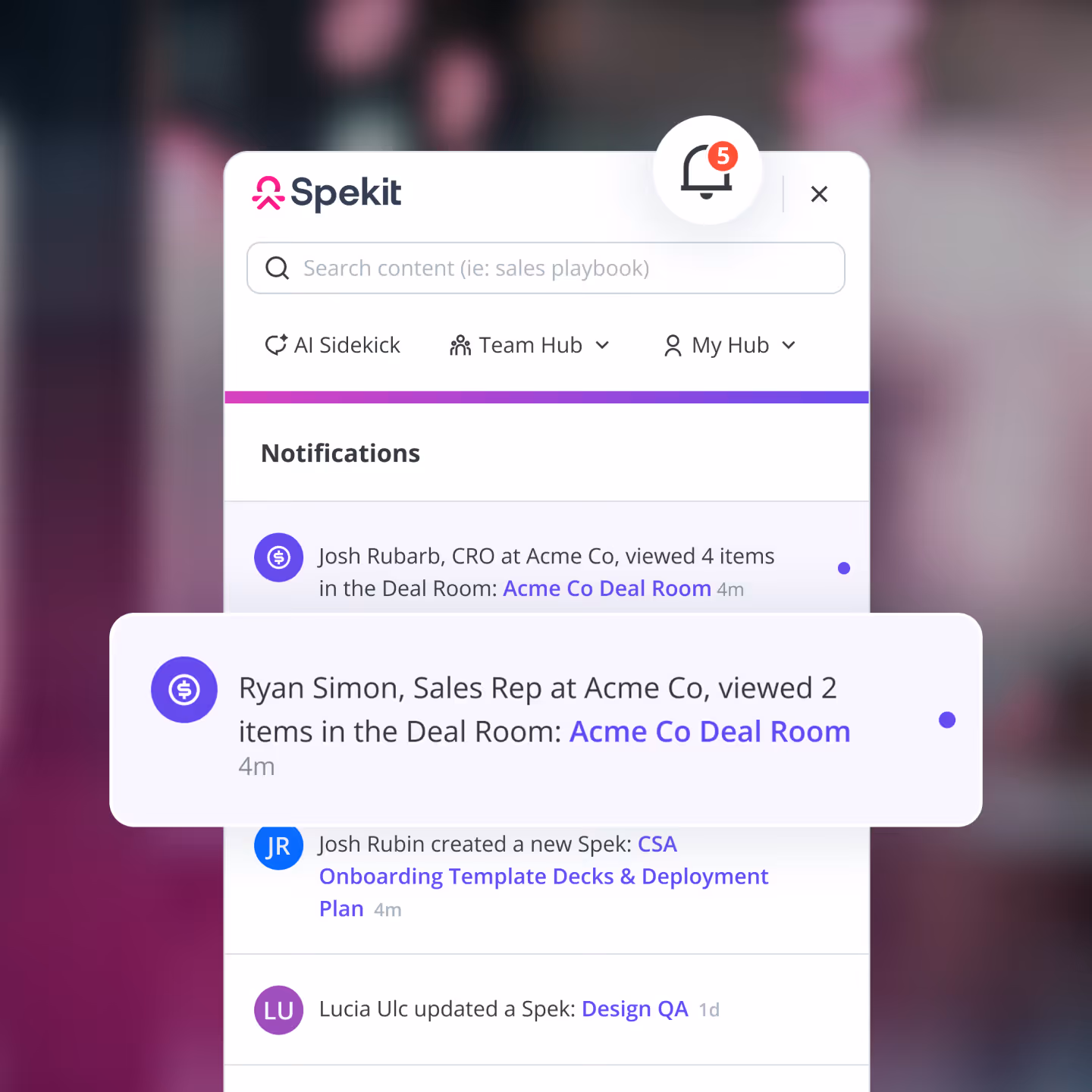 One space for every deal, built for speed. Spekit Deal Rooms streamline content personalization, track buyer engagement, and accelerate sales cycles, from the first outreach through renewal.