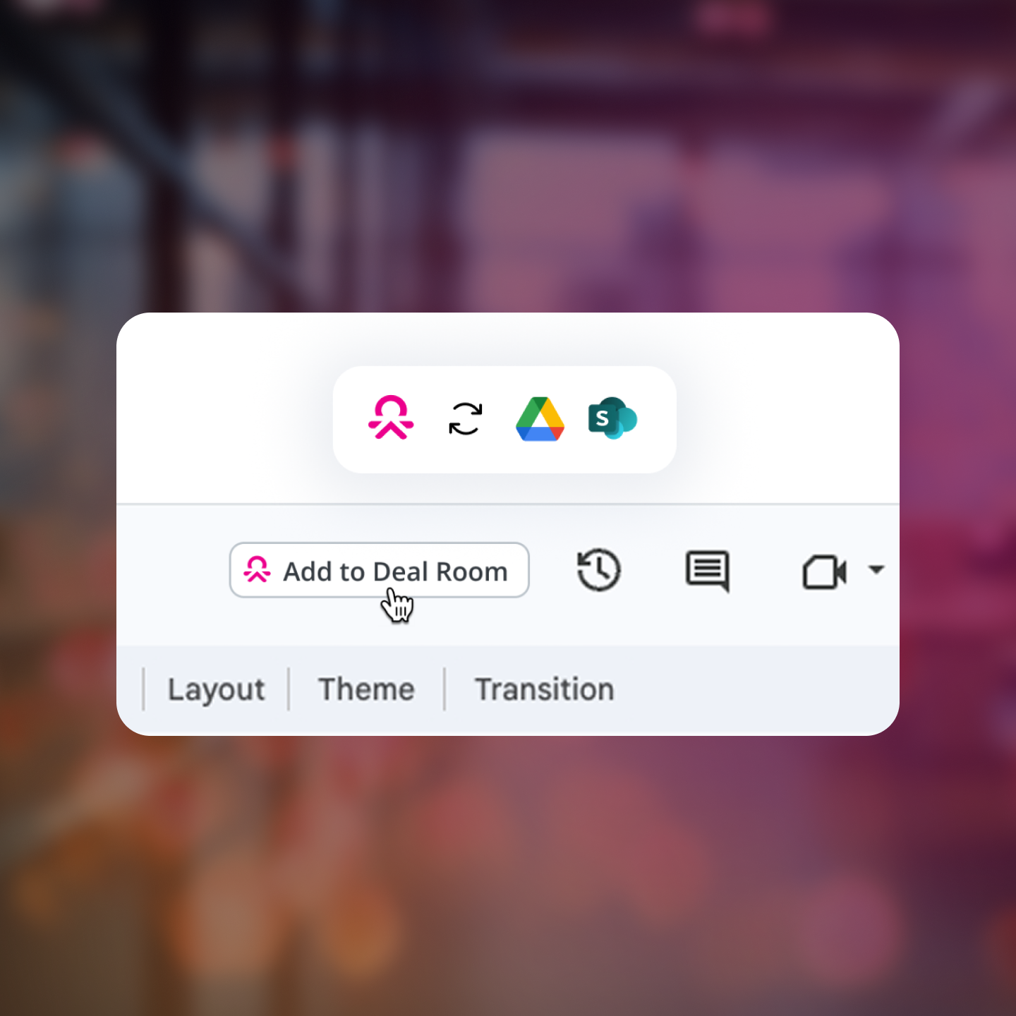 Add content synced from SharePoint, Google Drive, or Confluence directly into any deal room. When the source updates, the asset updates automatically so buyers always see the current version.