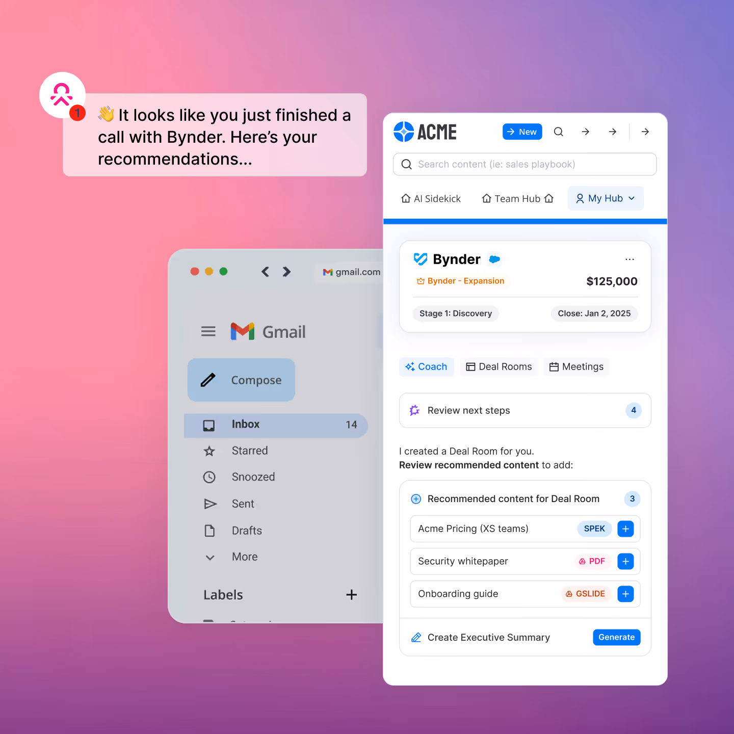 Spekit AI generates follow-ups, executive summaries, and Deal Rooms from Gong transcripts, Salesforce data, and approved GTM knowledge. Deal context and engagement signals tell reps when buyers are active.