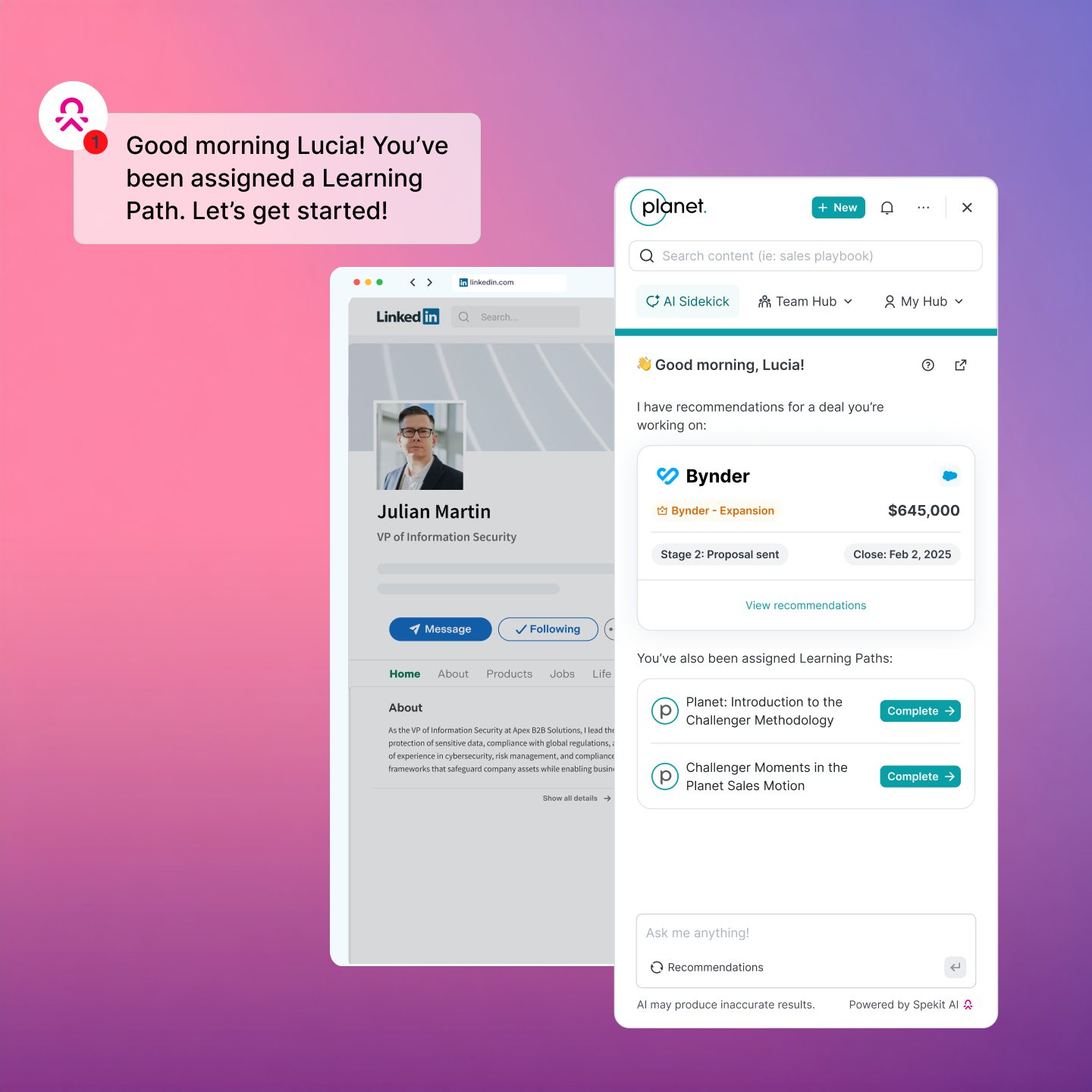 Spekit embeds your plays, stage criteria, and process standards directly into Salesforce, Gong, LinkedIn, and every other tool reps use, so the right behavior happens at the right moment without reps having to go look for it.